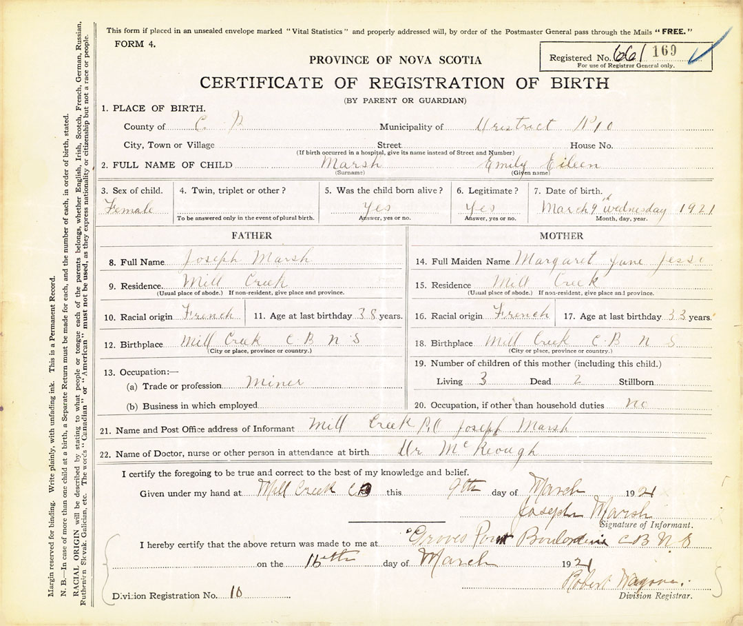 21. Name and Post Office address of Informant Joseph Marsh Mill Creek, Cape Breton