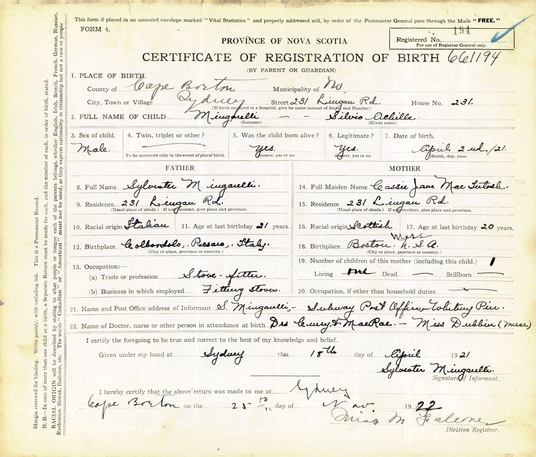 21. Name and Post Office address of Informant Sylvester Mingarelli Subway Post Office, Whitney Pier