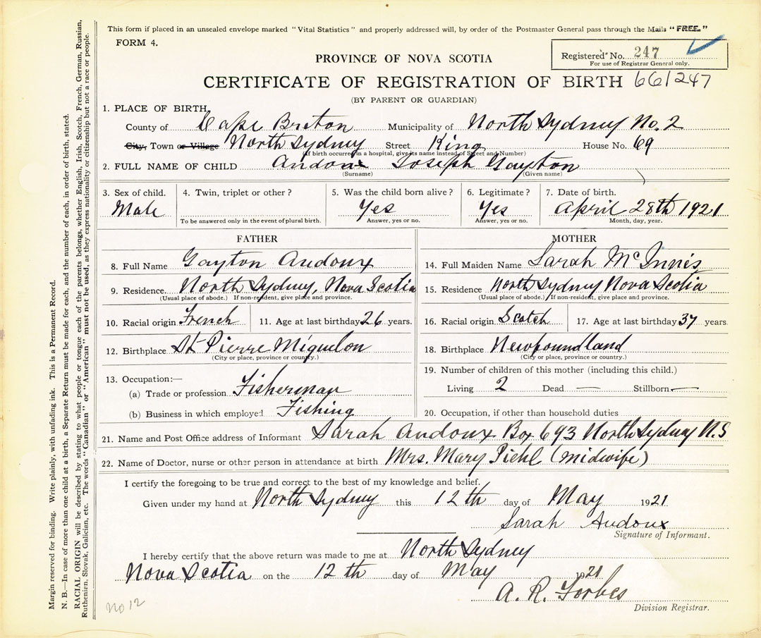 21. Name and Post Office address of Informant Sarah Andoux Box 693, North Sydney. Nova Scotia