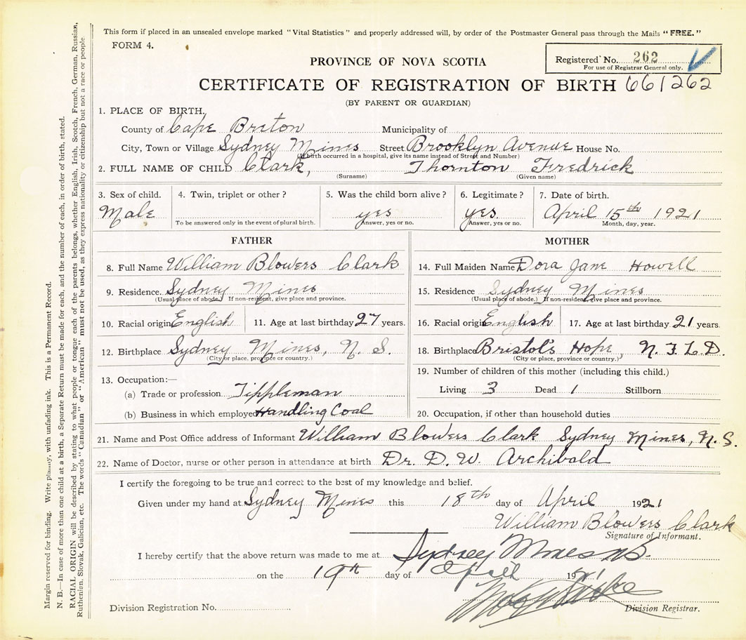 21. Name and Post Office address of Informant William Blowers Clark Sydney Mines, NS