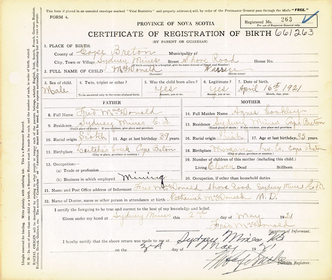 21. Name and Post Office address of Informant Fred MacDonald Shore Road, Sydney Mines, CB