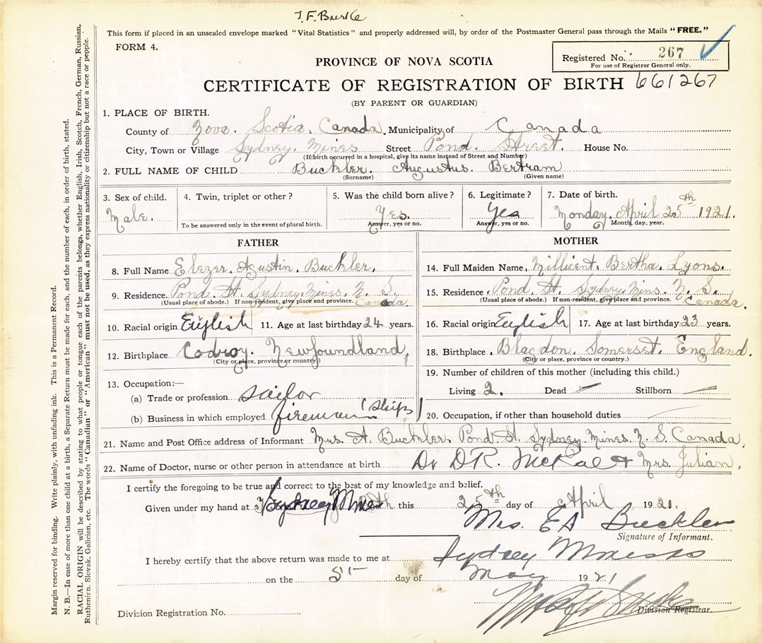 21. Name and Post Office address of Informant Mrs. A. Buckler Pond St. Sydney Mines, Canada