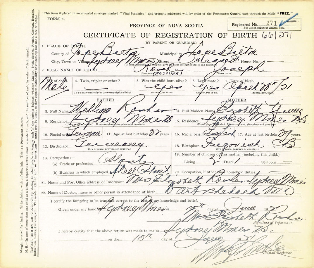 21. Name and Post Office address of Informant Mrs. Elizabeth Rosher Sydney Mines