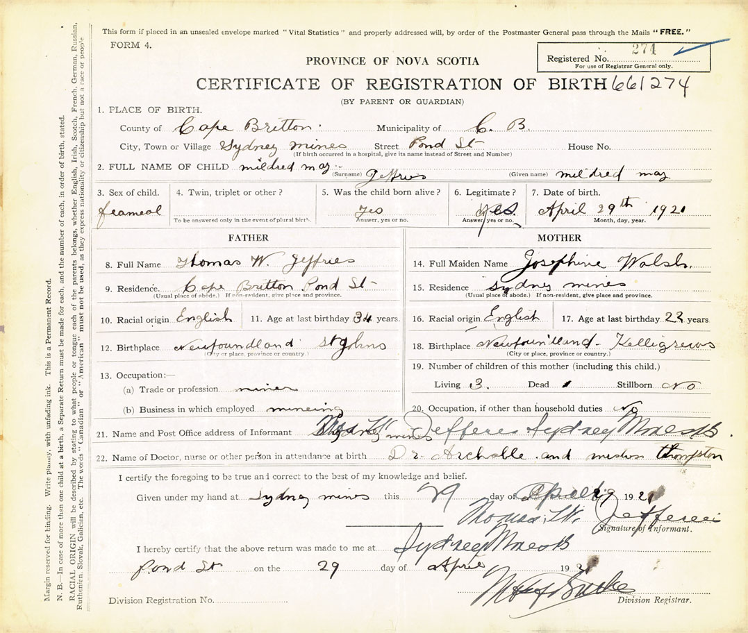 Female Birth Registration: Year: 1921 number: 66100274