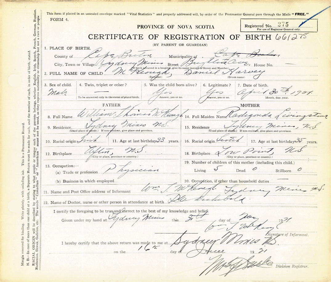 21. Name and Post Office address of Informant Wm T McKeough Sydney Mines