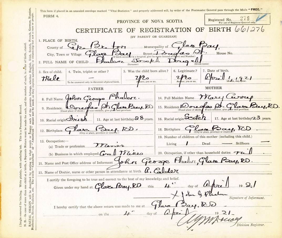 21. Name and Post Office address of Informant John George Phalen Glace Bay