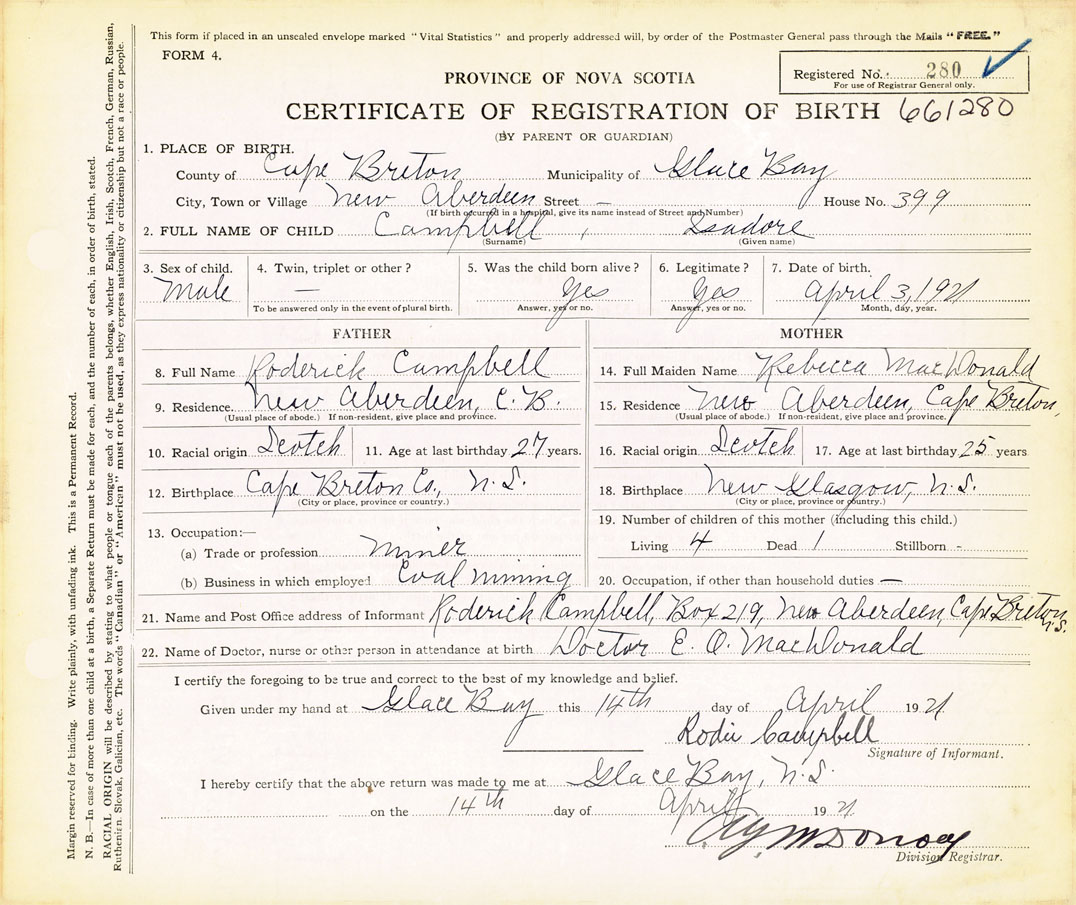 21. Name and Post Office address of Informant Roderick Campbell Box 219, New Aberdeen, Cape Breton