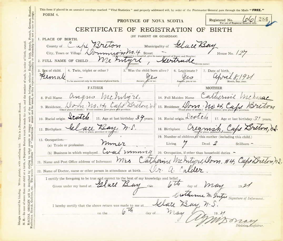 21. Name and Post Office address of Informant Mrs. Catherine McIntyre Dom. #4, Cape Breton