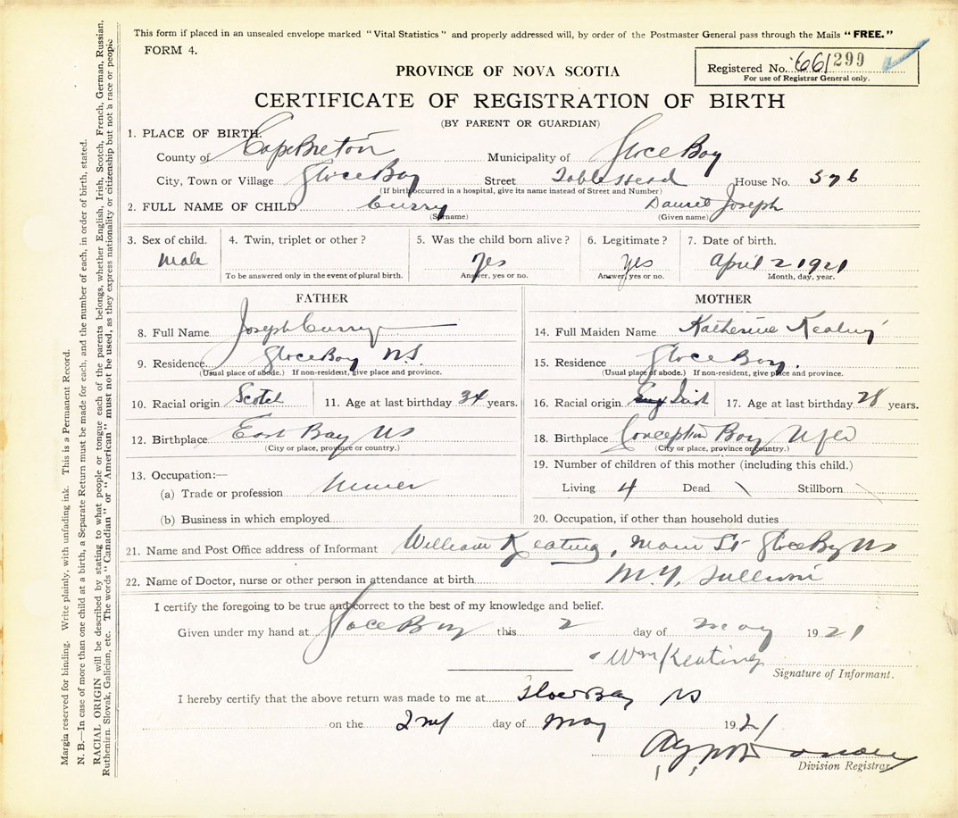 21. Name and Post Office address of Informant William Keating Main St. Glace Bay