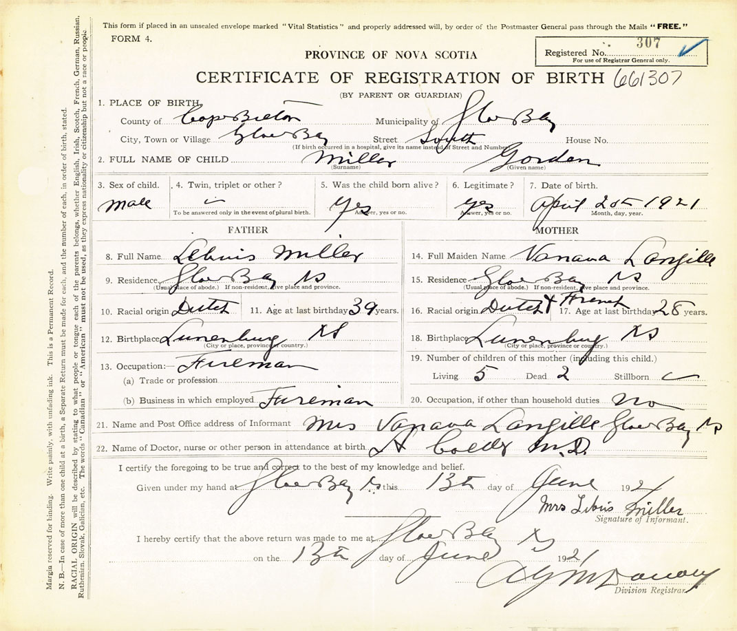 21. Name and Post Office address of Informant Mrs. Nanan Langille Glace Bay