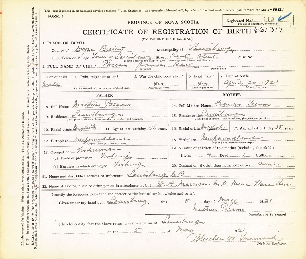 Male Birth Registration: Year: 1921 number: 66100319