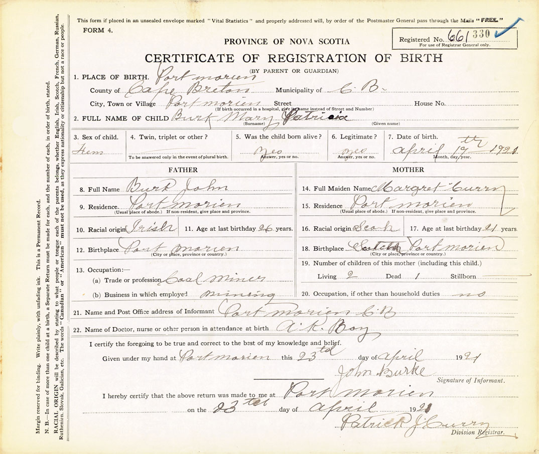 21. Name and Post Office address of Informant Port Morien, C.B.