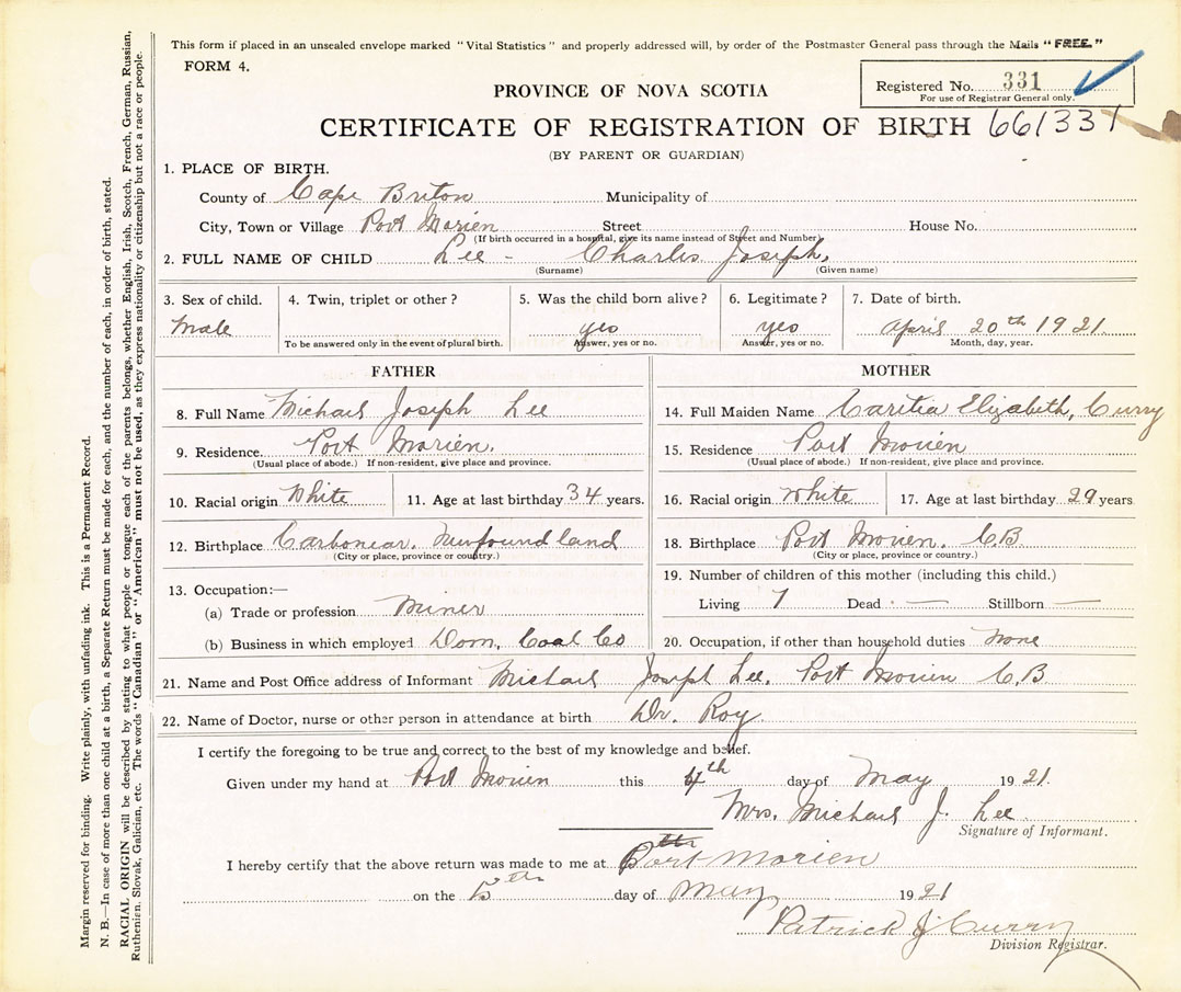 21. Name and Post Office address of Informant Michael Joseph Lee, Port Morien, C.B.