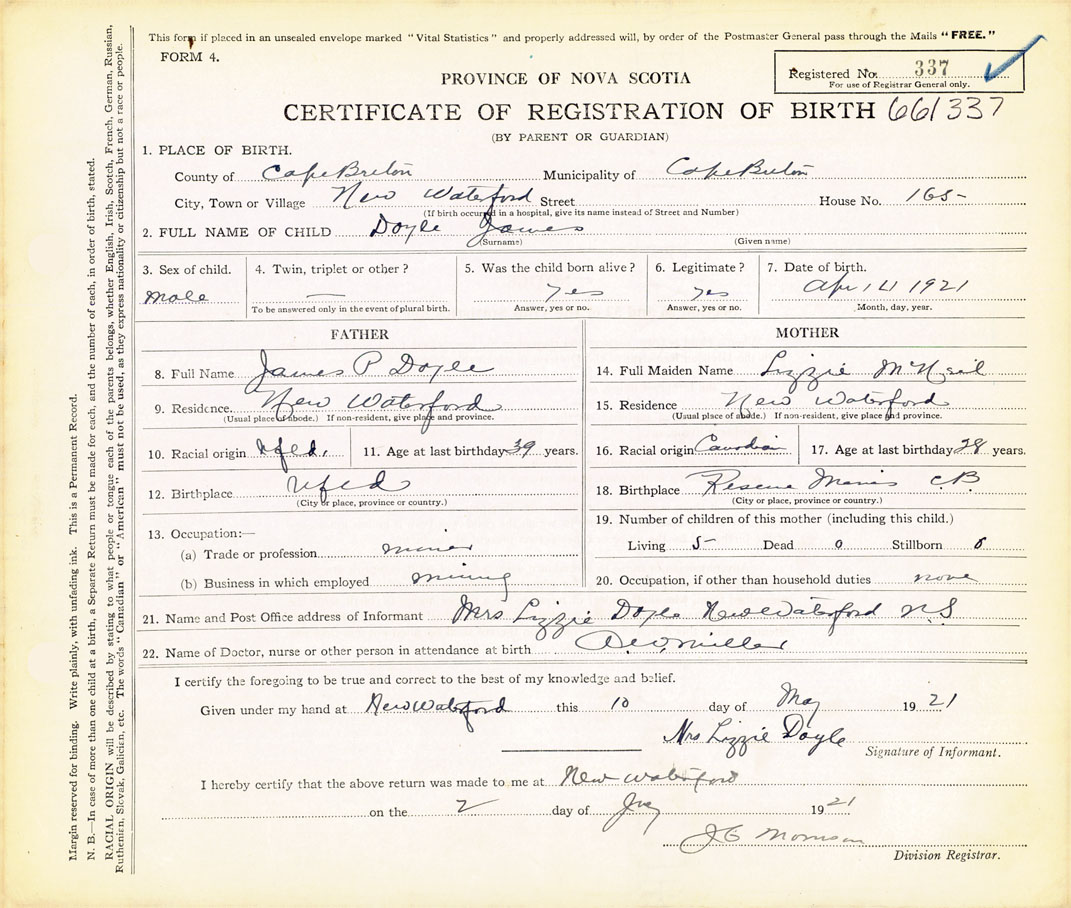 21. Name and Post Office address of Informant Mrs. Lizzie Doyle New Waterford