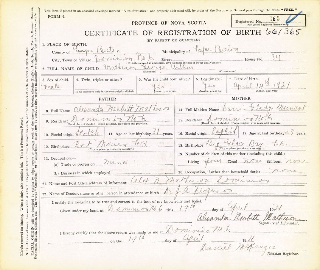 21. Name and Post Office address of Informant Alexander Nesbitt Matheson Dominion