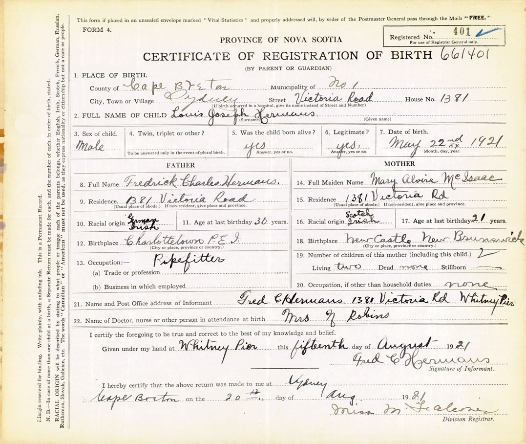 21. Name and Post Office address of Informant Fred C Hermans 1381 Victoria Rd., Whitney Pier
