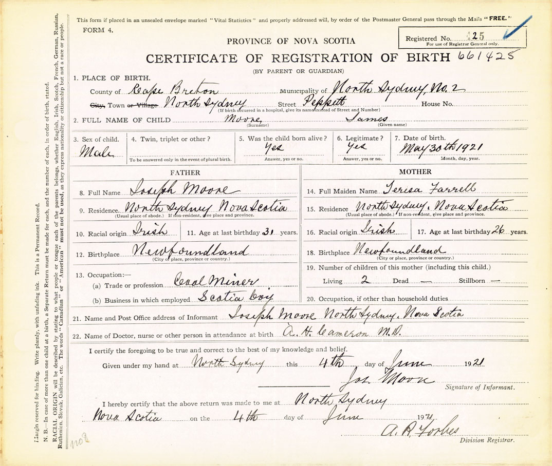 21. Name and Post Office address of Informant Joseph Moore North Sydney