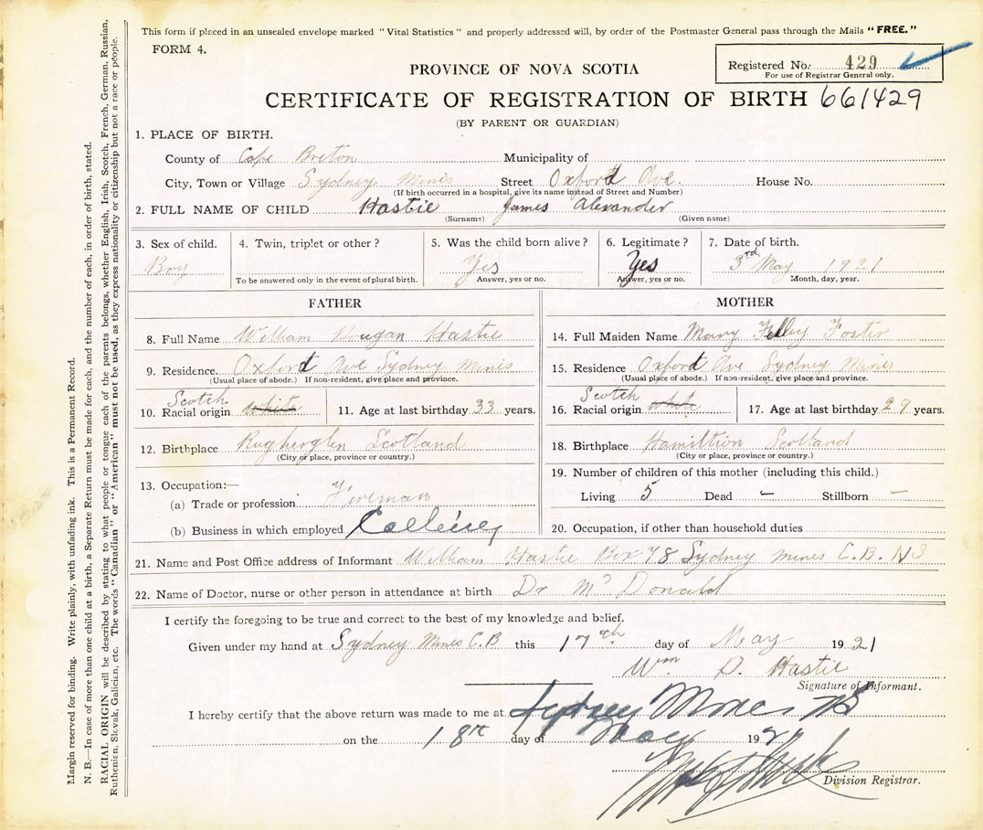 21. Name and Post Office address of Informant William Hastie Box 78 Sydney Mines C.B.