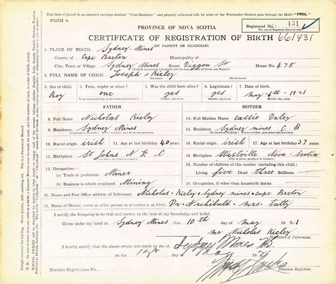 21. Name and Post Office address of Informant Nicholas Kieley Sydney Mines, Cape Breton