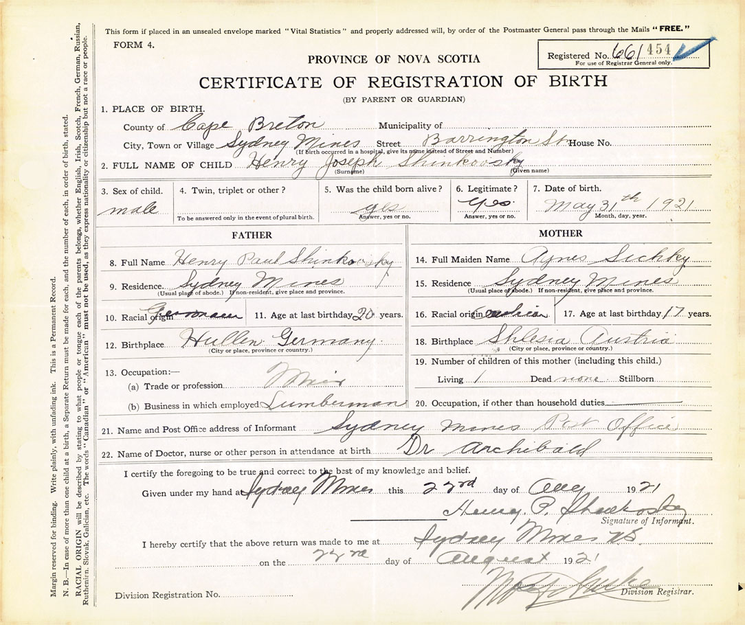 21. Name and Post Office address of Informant Henry P Shinkovsky Sydney Mines Post Office