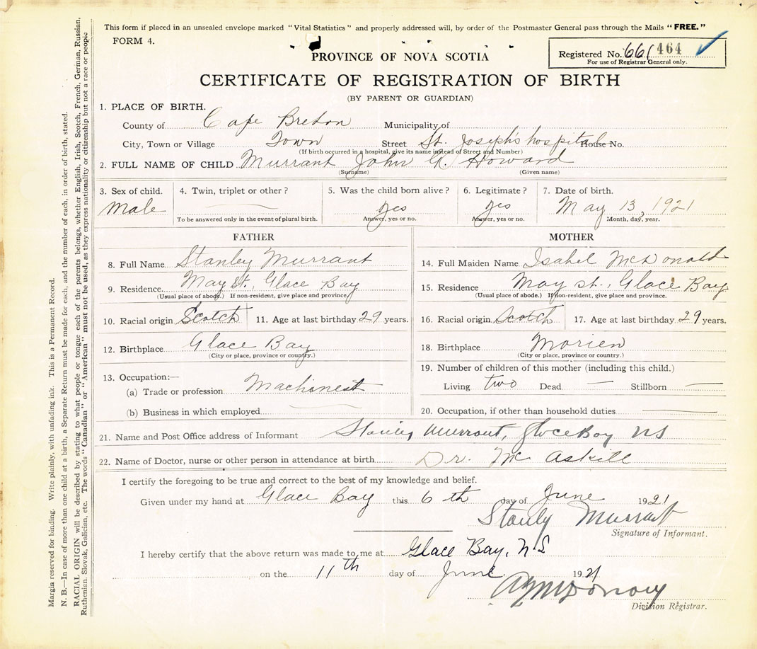 21. Name and Post Office address of Informant Stanley Murrant Glace Bay