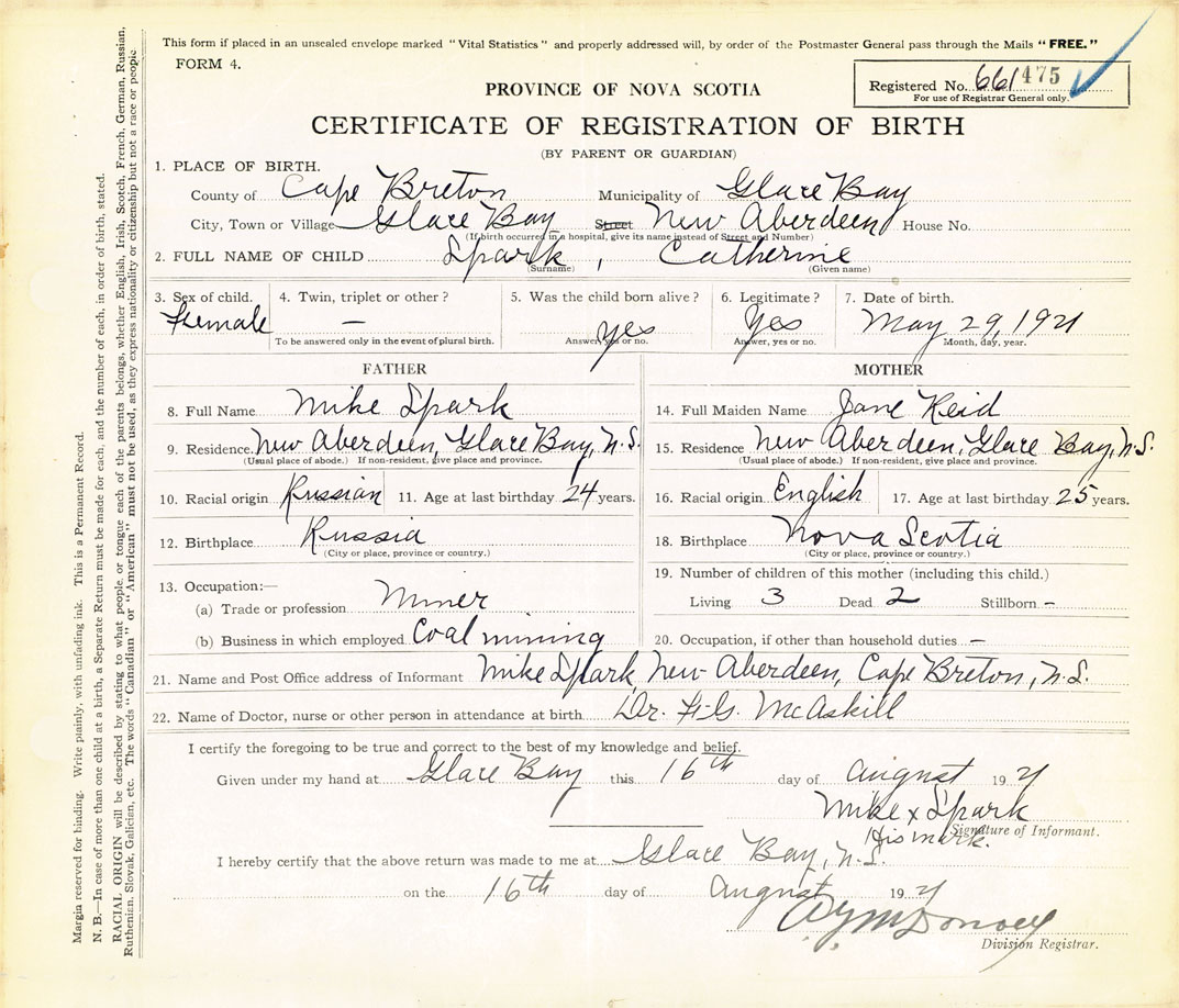 21. Name and Post Office address of Informant Mike Spark New Aberdeen, Cape Breton