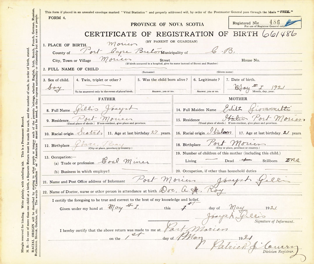 21. Name and Post Office address of Informant Joseph Gillis Port Morien