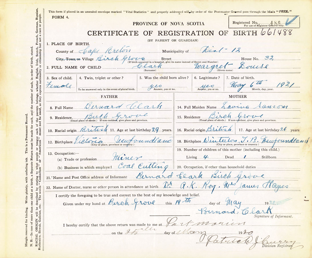 21. Name and Post Office address of Informant Bernard Clark Birch Grove, Cape Breton
