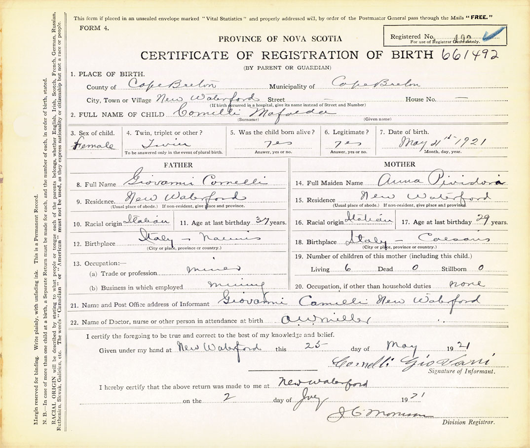 21. Name and Post Office address of Informant Giovannie Comilli New Waterford, Cape Breton