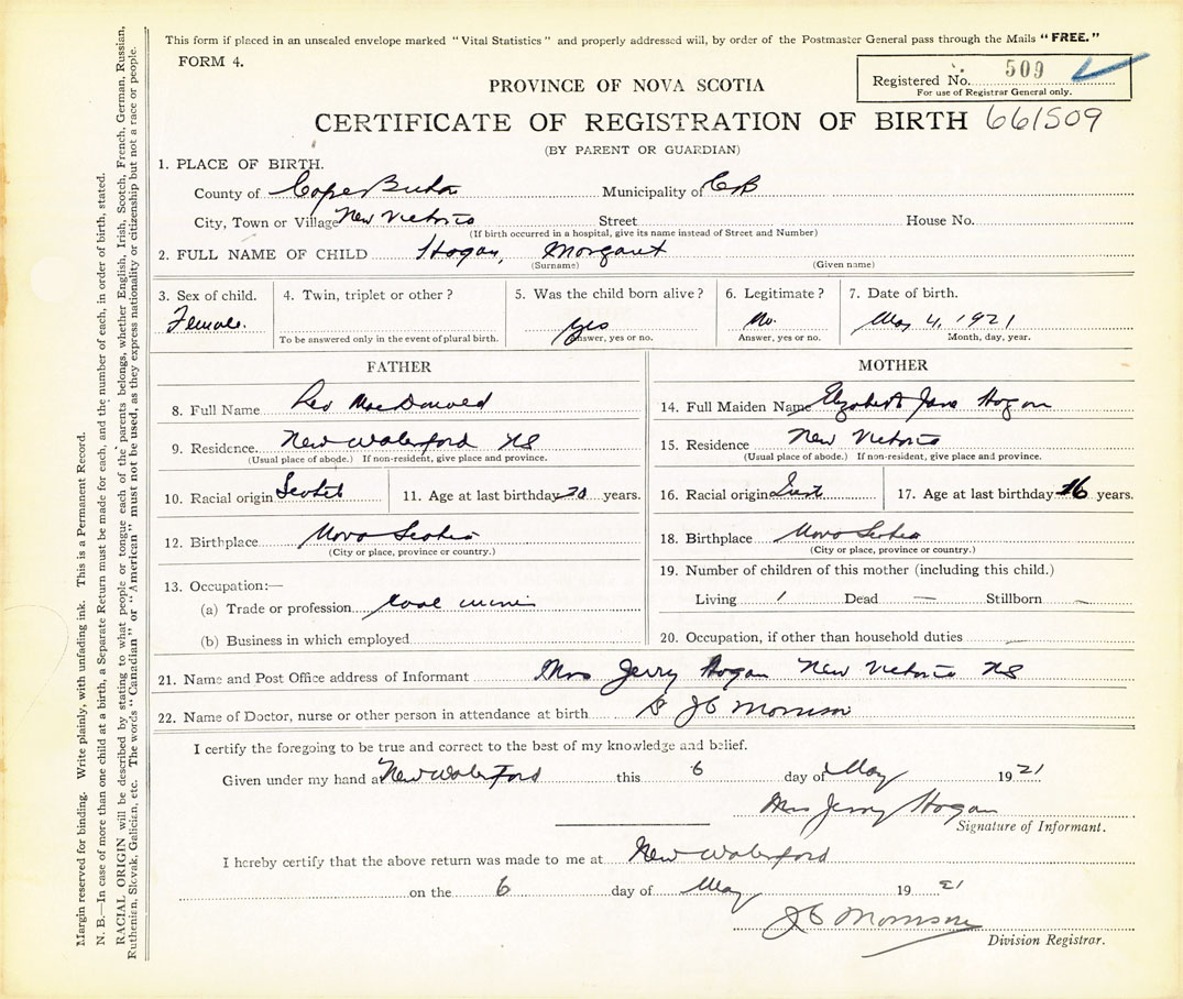 21. Name and Post Office address of Informant Mrs. Jerry Hogan New Waterford, Cape Breton
