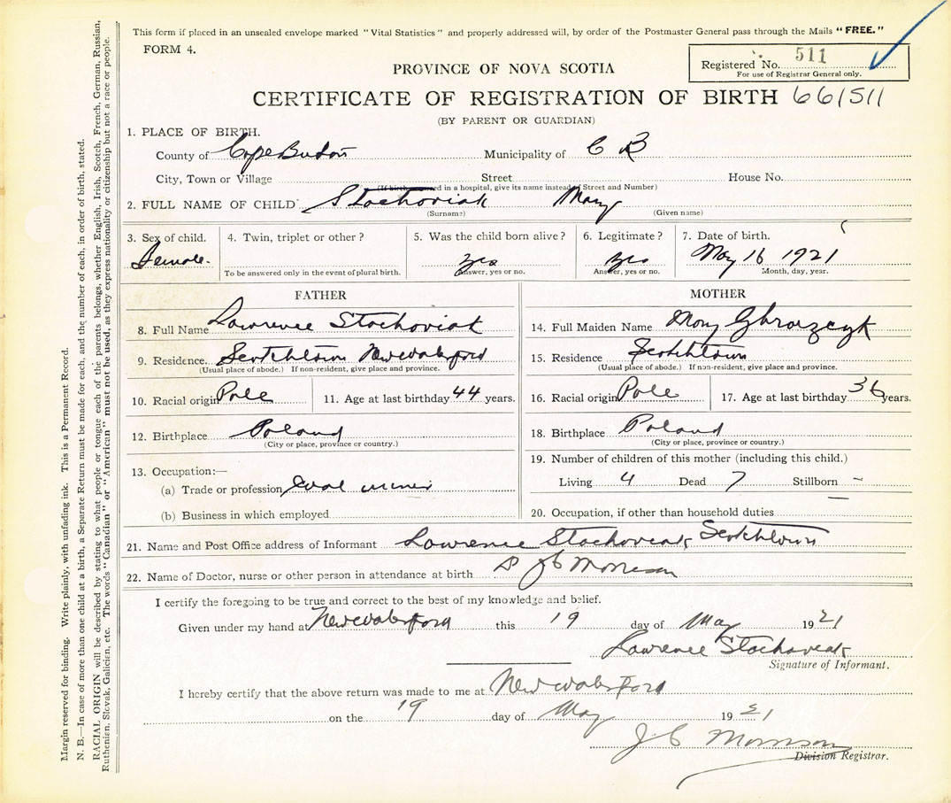 21. Name and Post Office address of Informant Lawrence Stochoviak Scotchtown, New Waterford, Cape Breton