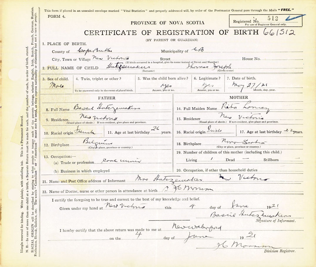21. Name and Post Office address of Informant Mrs. Hutczemakers New Victoria, Cape Breton