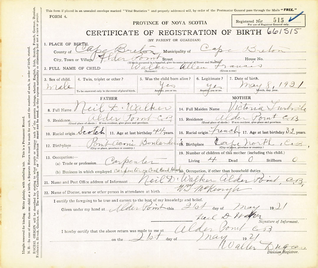 21. Name and Post Office address of Informant Neil D. Walker Alder Point, Cape Breton
