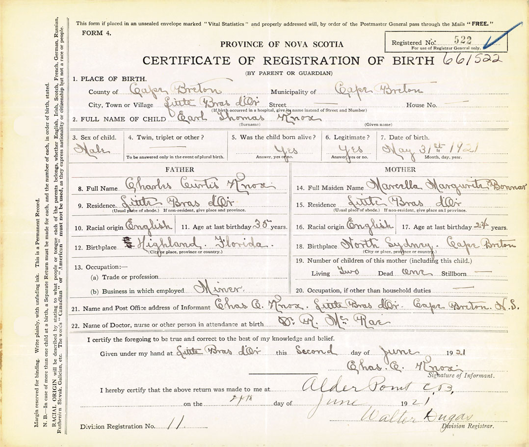 21. Name and Post Office address of Informant Charles C. Knox Little Bras d'Or, Cape Breton