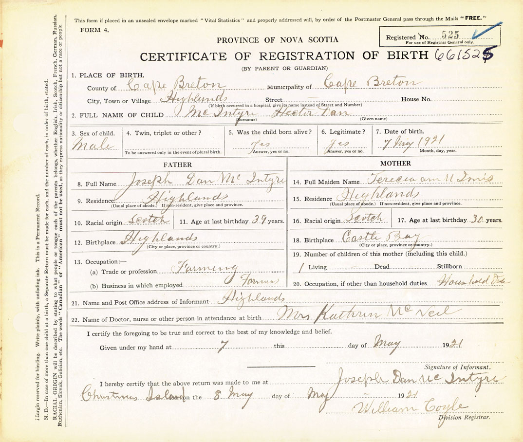 21. Name and Post Office address of Informant Joseph Dan McIntyre Highlands