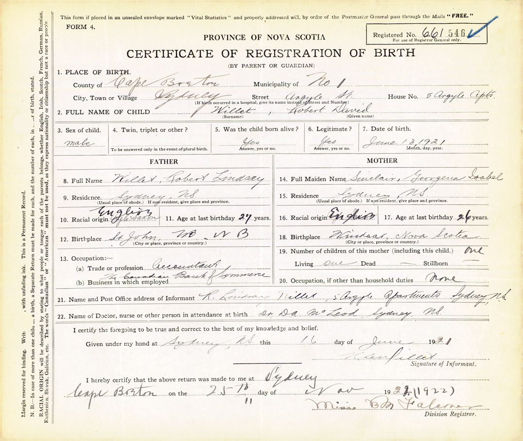 22. Name of Doctor, nurse or other person in attendance at birth Dr. D. A. McLeod, Sydney, Cape Breton