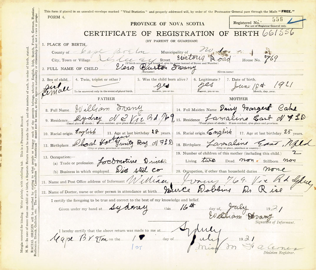 21. Name and Post Office address of Informant William Ivany 769 Victoria Road, Sydney, Cape Breton
