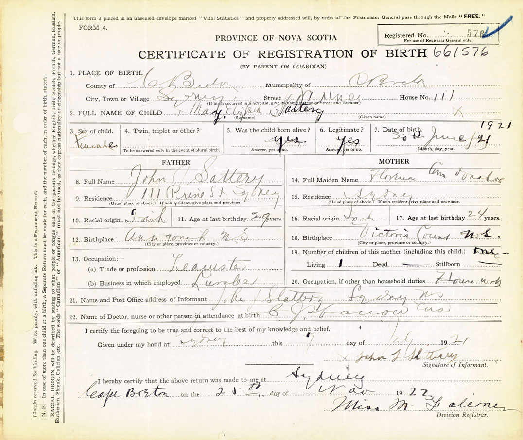 Note: Family name is Slattery... see informant/fathers signature. Also Reference Archived Marriage Cert of 1920.
