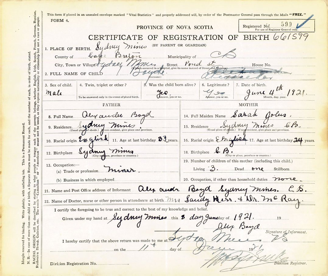 21. Name and Post Office address of Informant Alex Boyd Sydney Mines, CB