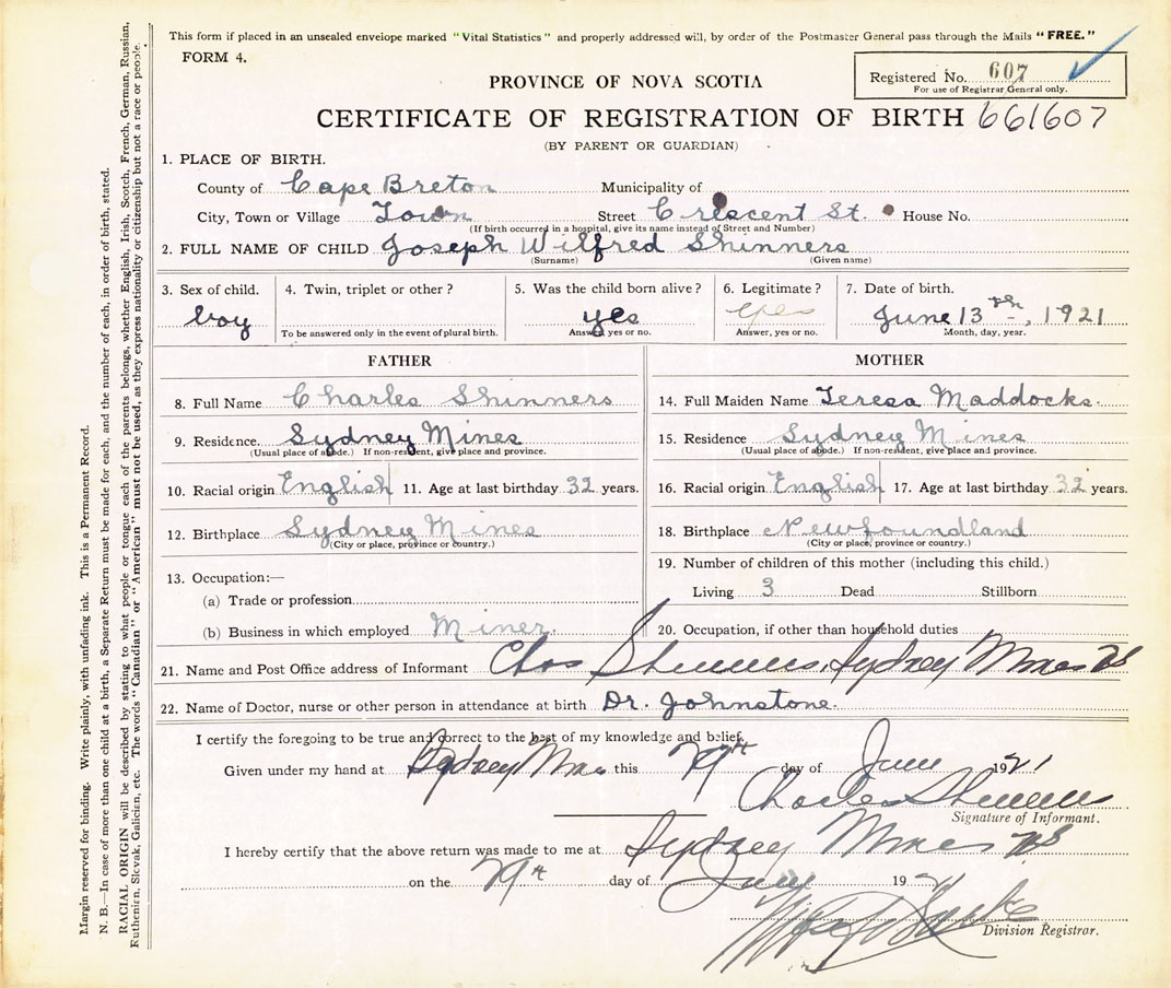 21. Name and Post Office address of Informant Charles Shinners Sydney Mines, Cape Breton