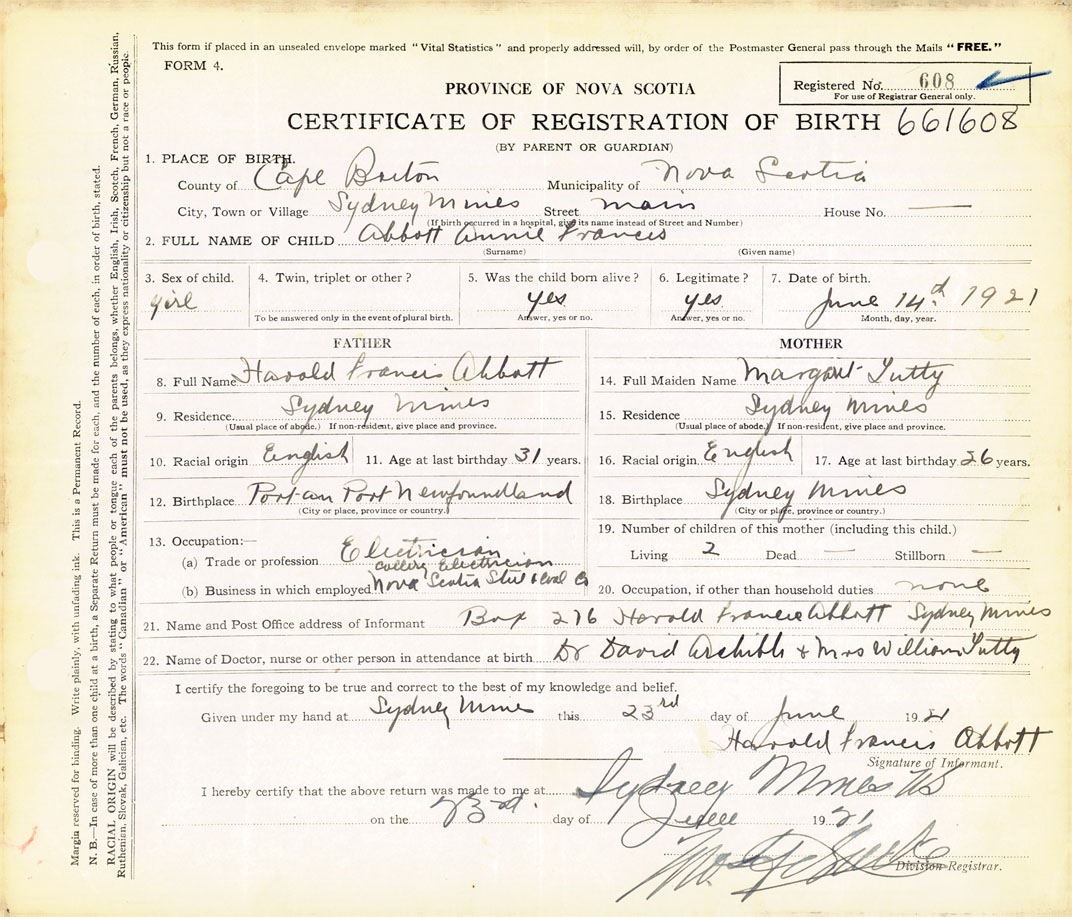 21. Name and Post Office address of Informant Harold Francis Abbott Box 276, Sydney Mines, Cape Breton