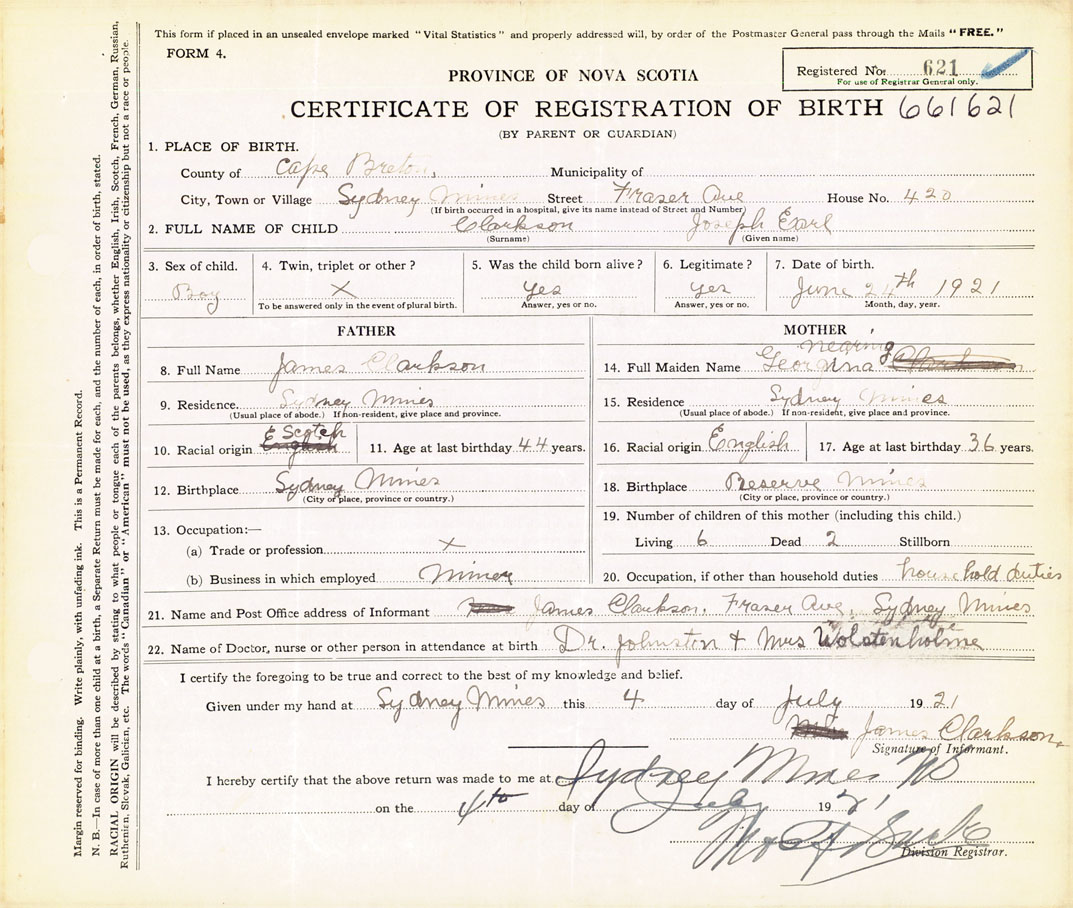 21. Name and Post Office address of Informant James Clarkson Fraser Avenue, Sydney Mines, Cape Breton
