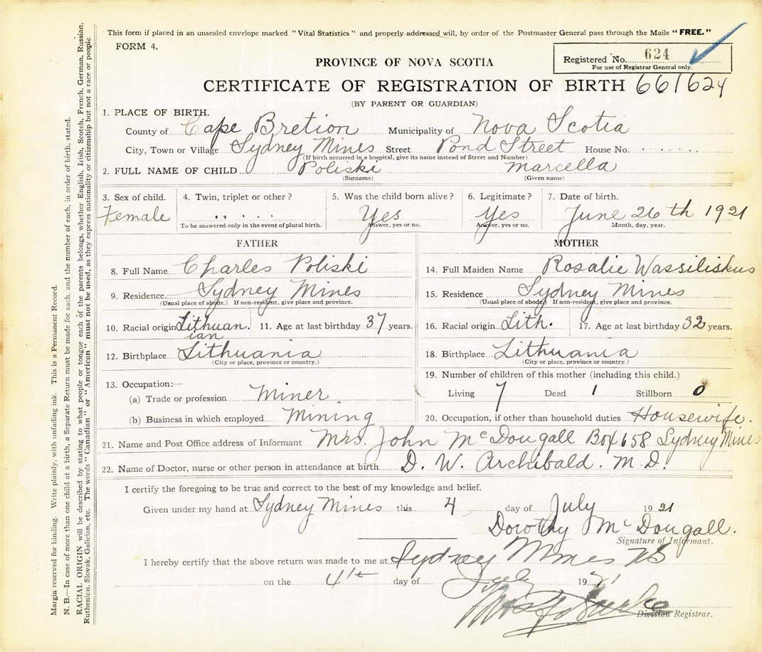21. Name and Post Office address of Informant Mrs. John Mcdougall Box 658, Sydney Mines, Cape Breton