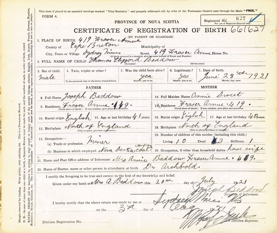 21. Name and Post Office address of Informant Mrs. Annie Beddow 419 Fraser Avenue, Sydney Mines, Cape Breton