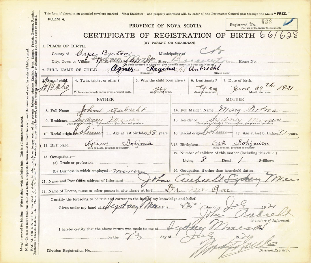 21. Name and Post Office address of Informant John Aubrecht Sydney Mines, Cape Breton