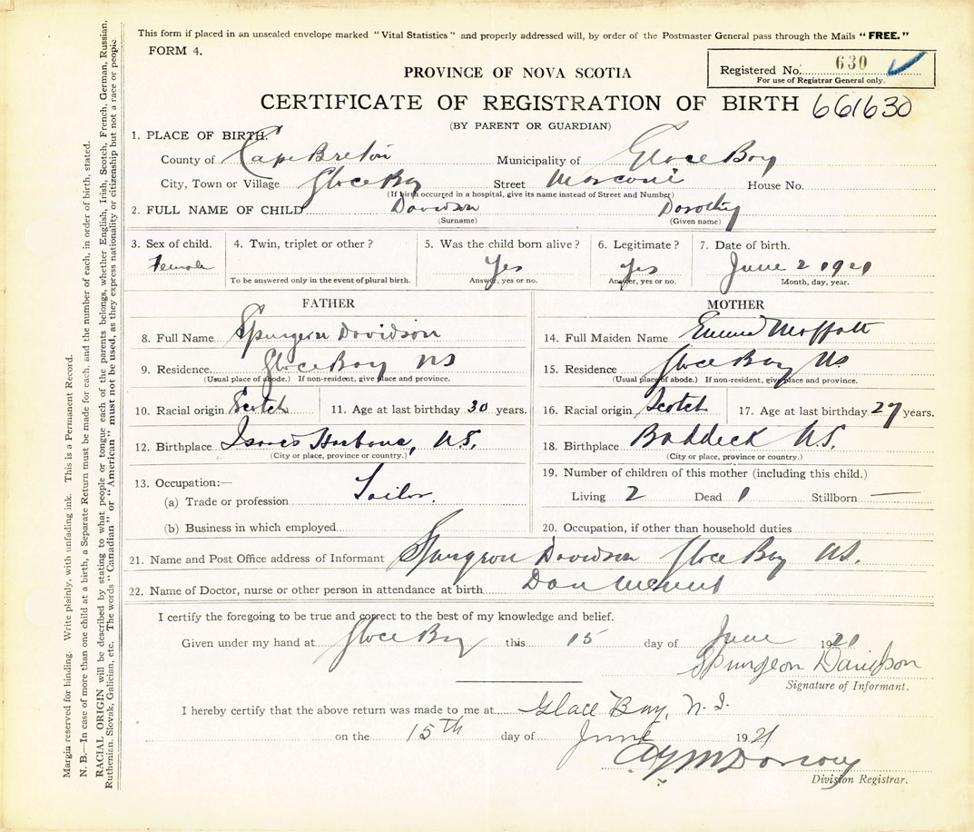 21. Name and Post Office address of Informant Spurgeon Davidson Glace Bay, Cape Breton