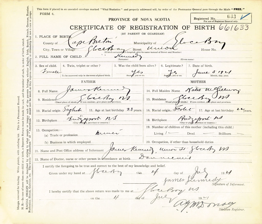 21. Name and Post Office address of Informant James Kennedy Union Street, Glace Bay