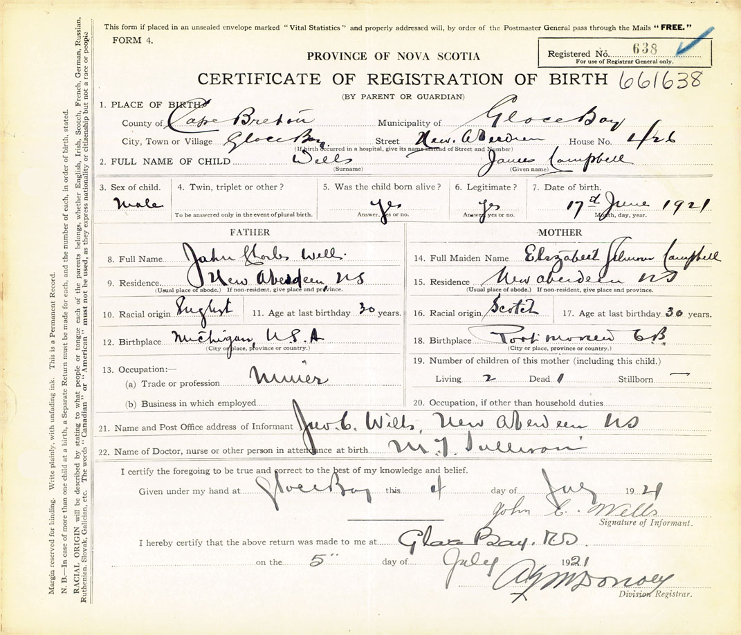 21. Name and Post Office address of Informant Jno C Wells New Aberdeen, Ns