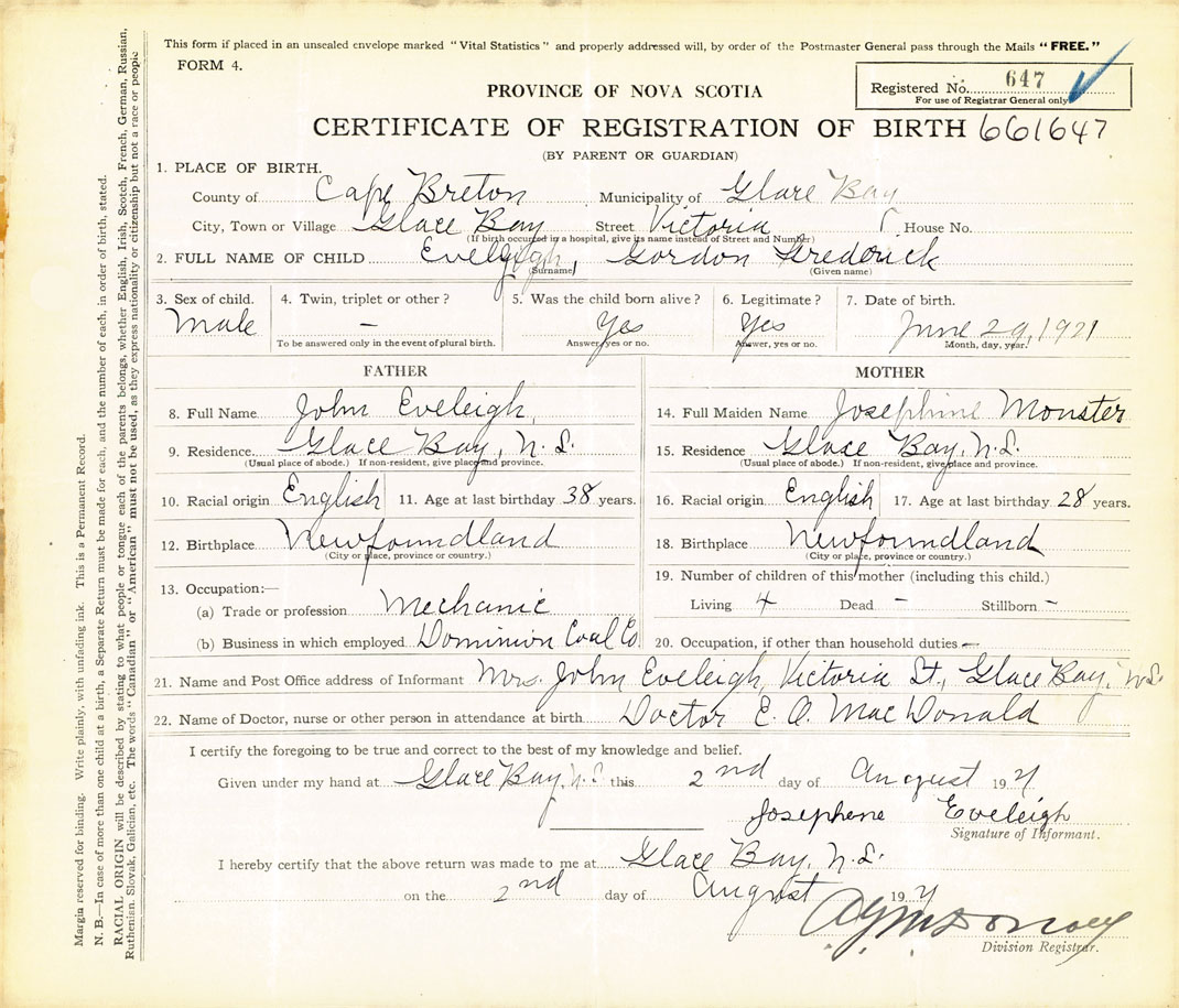 21. Name and Post Office address of Informant Mrs. John Eveleigh Victoria St., Glace Bay