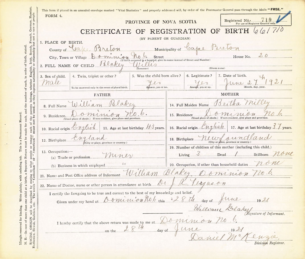 21. Name and Post Office address of Informant William Blakey Dominion No. 6